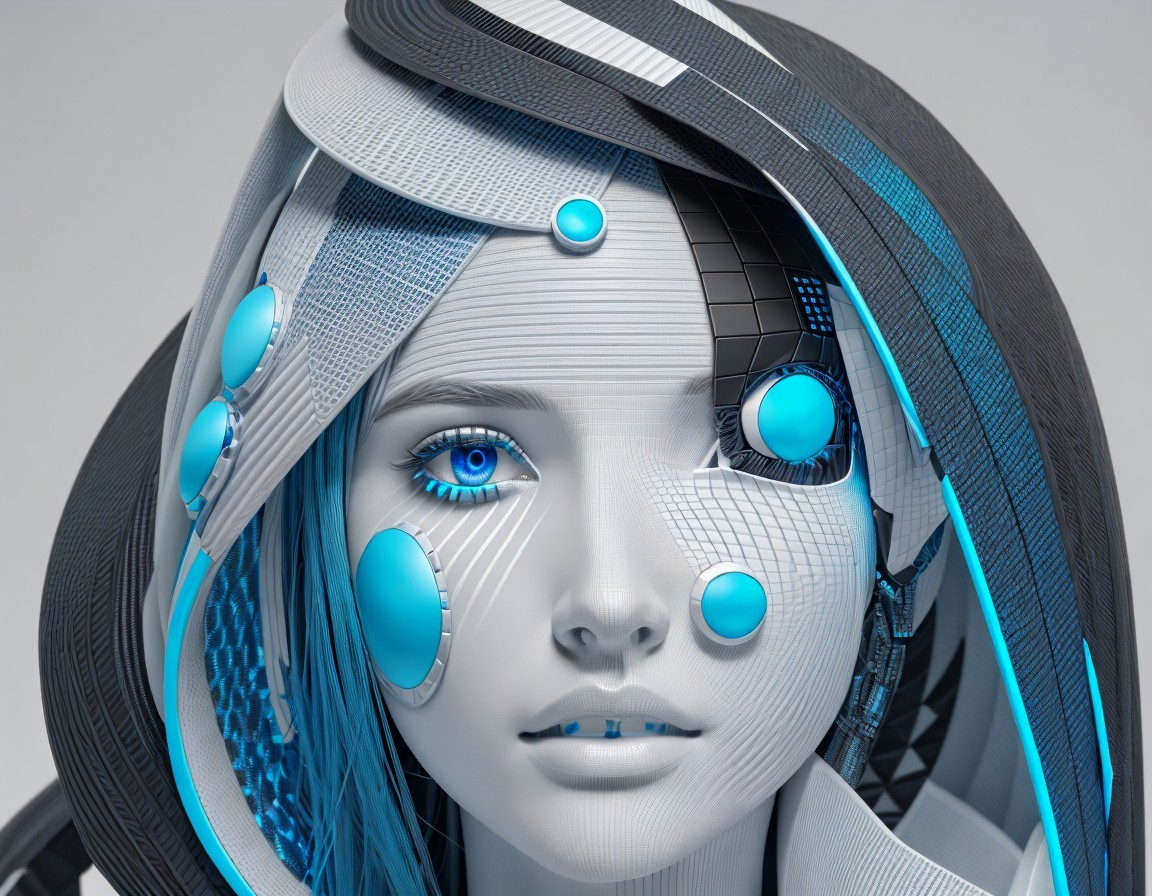A digital art portrait featuring a female figure with futuristic blue and white headgear, luminous eyes, and intricate patterns.