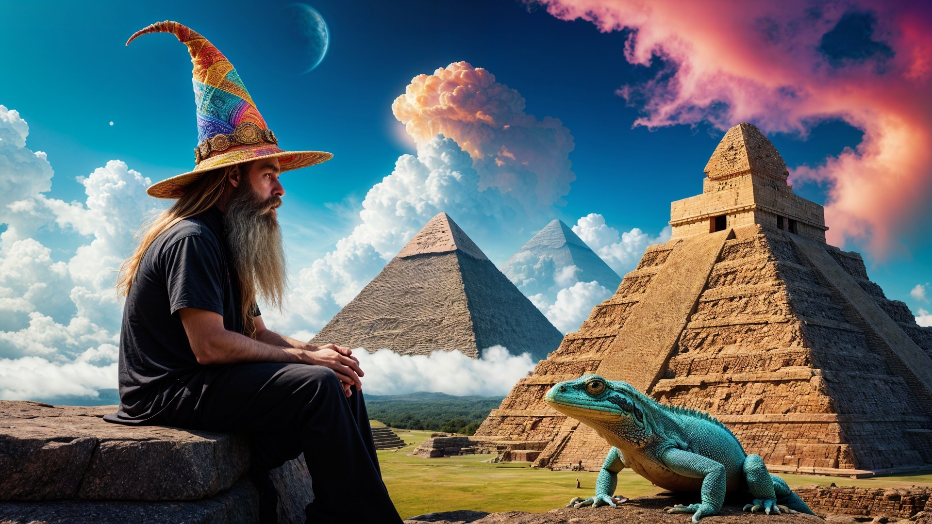 Prompt: "Man with long beard, wizard hat, sitting majestically on giant lizard, ancient pyramid backdrop, intricate psychedelic patterns, vibrant colors, as above so below concept, spore clouds emanating, psychedelic frog companion, fairytale ambiance, mystical dimensions, reminiscent of "Wanderer above the Sea of Fog", hyperrealistic details, interwoven psychedelic elements, surreal interconnections, intricate linework, cosmic energy, digital artwork, fantasy realism, by visionary artist Alex Grey, Artstation, high resolution."