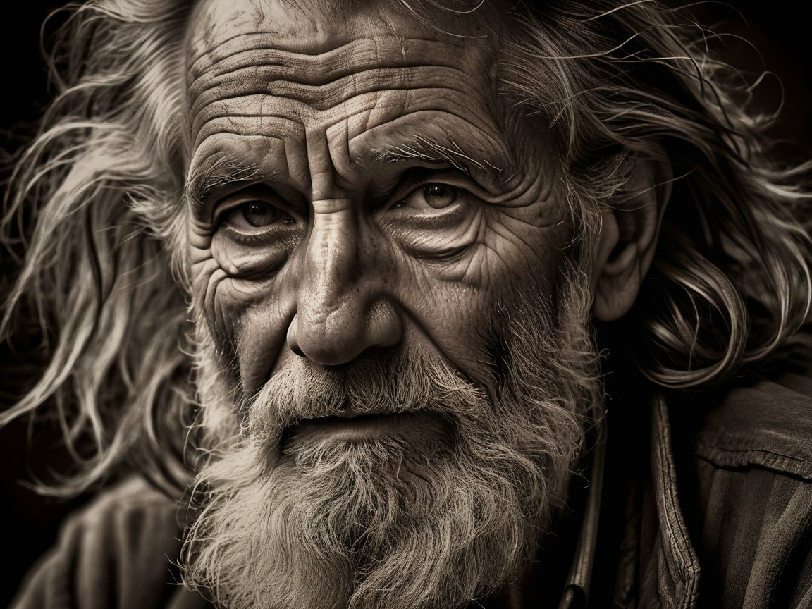 The image depicts an elderly man with deep-set wrinkles and a long, unkempt beard. His intense gaze reflects wisdom and a lifetime of experiences, set against a dark background.