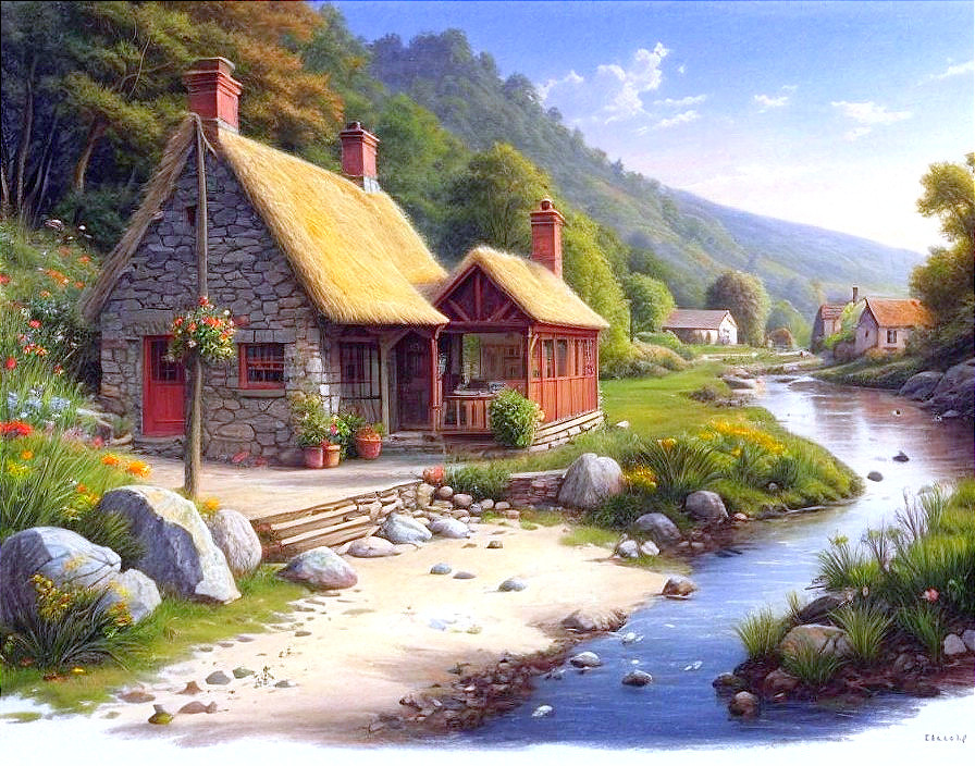 A serene landscape featuring a stone cottage with a thatched roof nestled by a gentle stream, surrounded by lush greenery and distant houses.