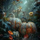 Three intricately designed pumpkins in vibrant orange and blue tones are surrounded by colorful flowers. The pumpkins feature detailed floral patterns, creating a whimsical autumn scene.