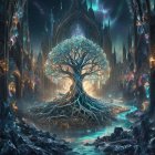 Majestic tree with glowing roots in cosmic landscape