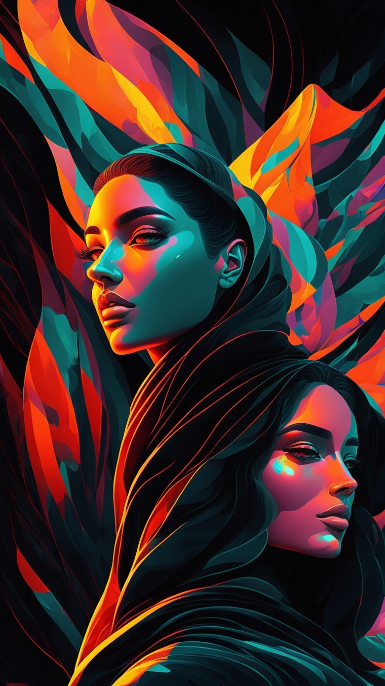 The image features three stylized female faces, intricately intertwined with vibrant reds and blues, creating a dynamic, flowing composition that conveys depth and emotion.