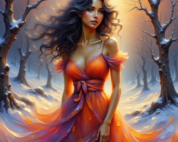 A glamorous figure in a stunning red gown embellished with intricate beadwork. Her confident pose and elegant hairstyle exude sophistication against a dark background.