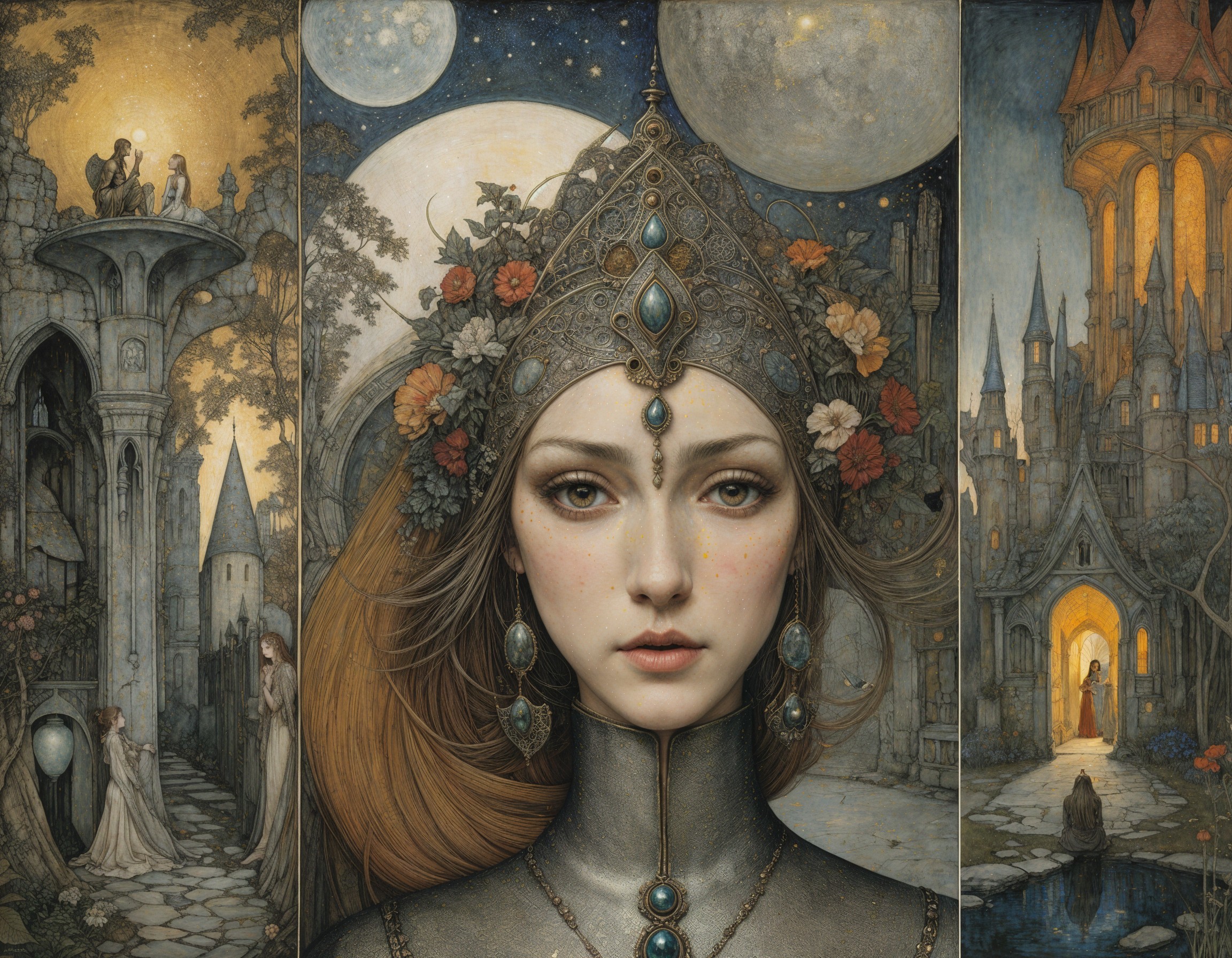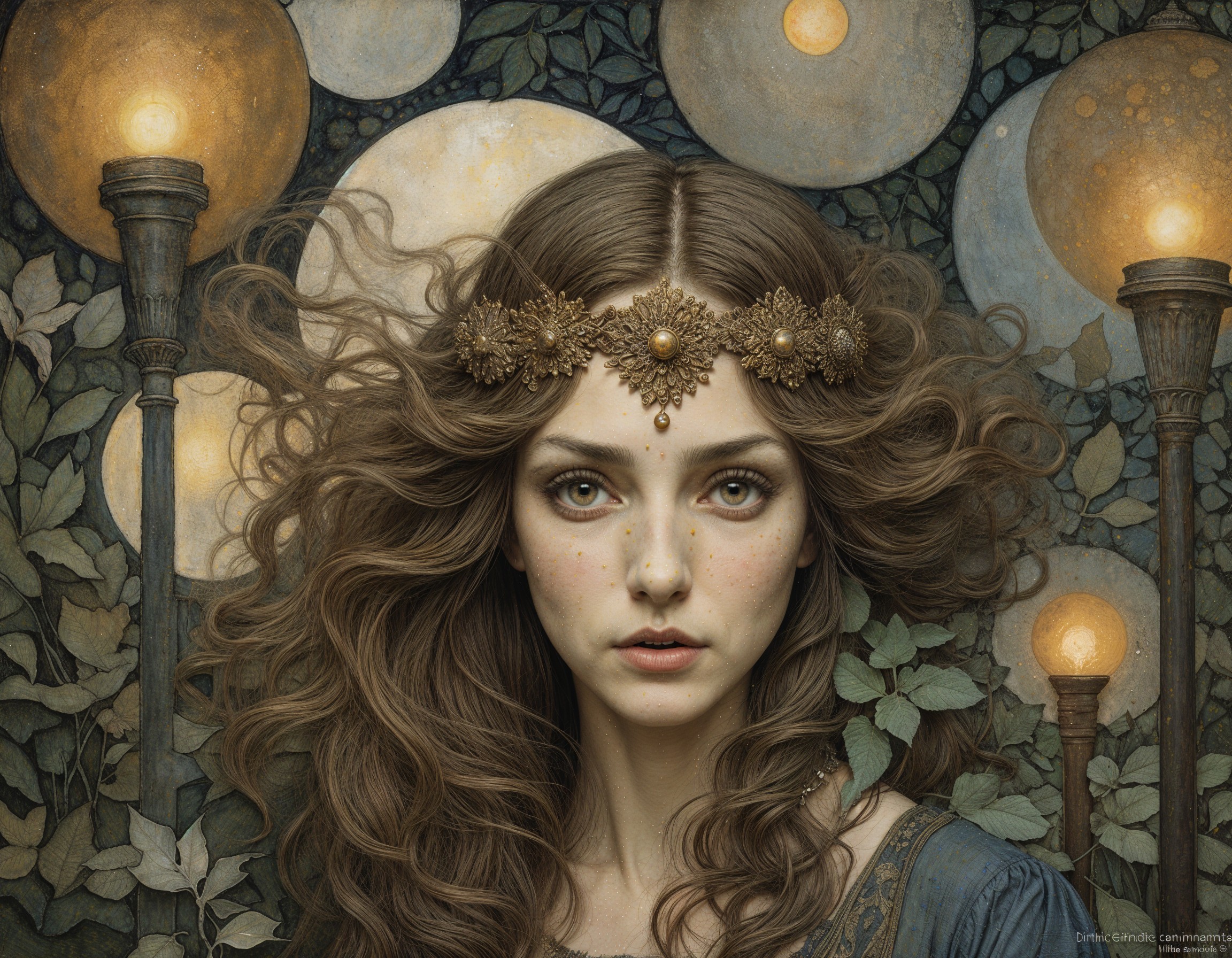 A young woman with long, wavy hair adorned with a jeweled headpiece gazes intently. She is framed by ivy and vintage lanterns, creating a mystical, enchanting atmosphere.