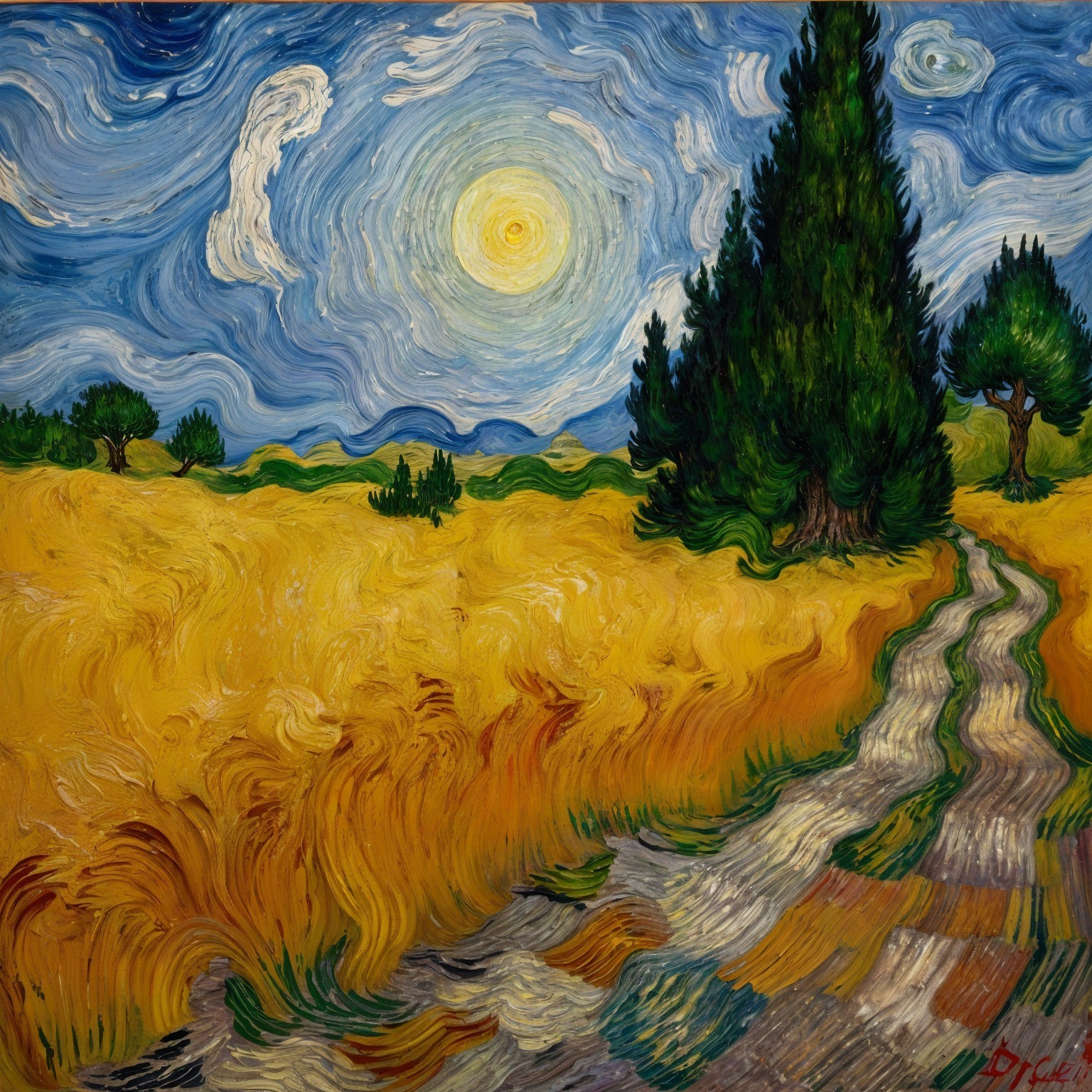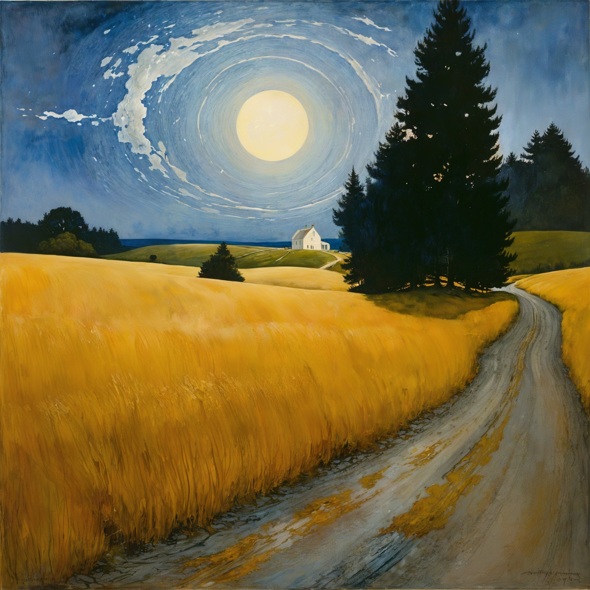 A serene landscape features a winding dirt road leading to a solitary house, surrounded by golden fields under a bright moonlit sky with swirling clouds and dark trees in the distance.