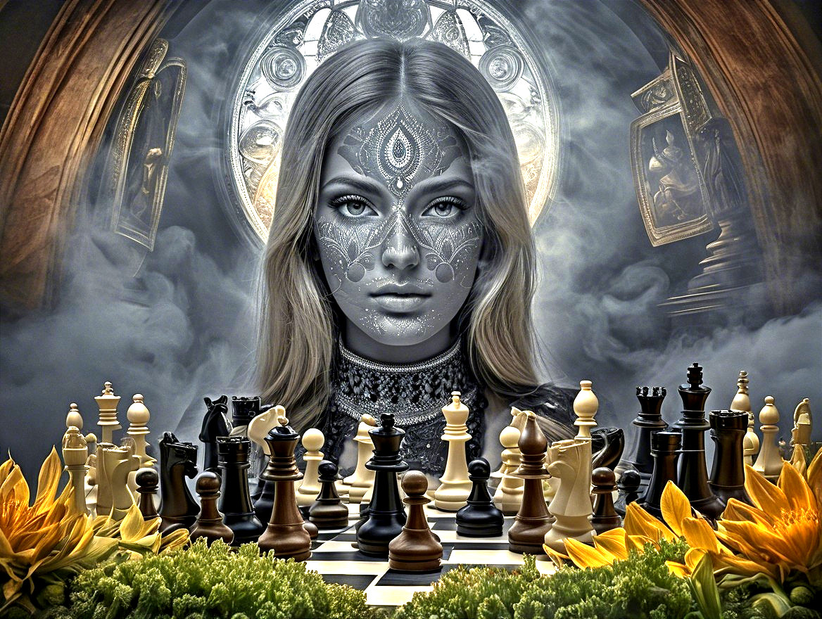 A mystical scene featuring a woman with intricate face paint, surrounded by a chessboard and sunflowers, against a backdrop of ethereal light and ornate designs.