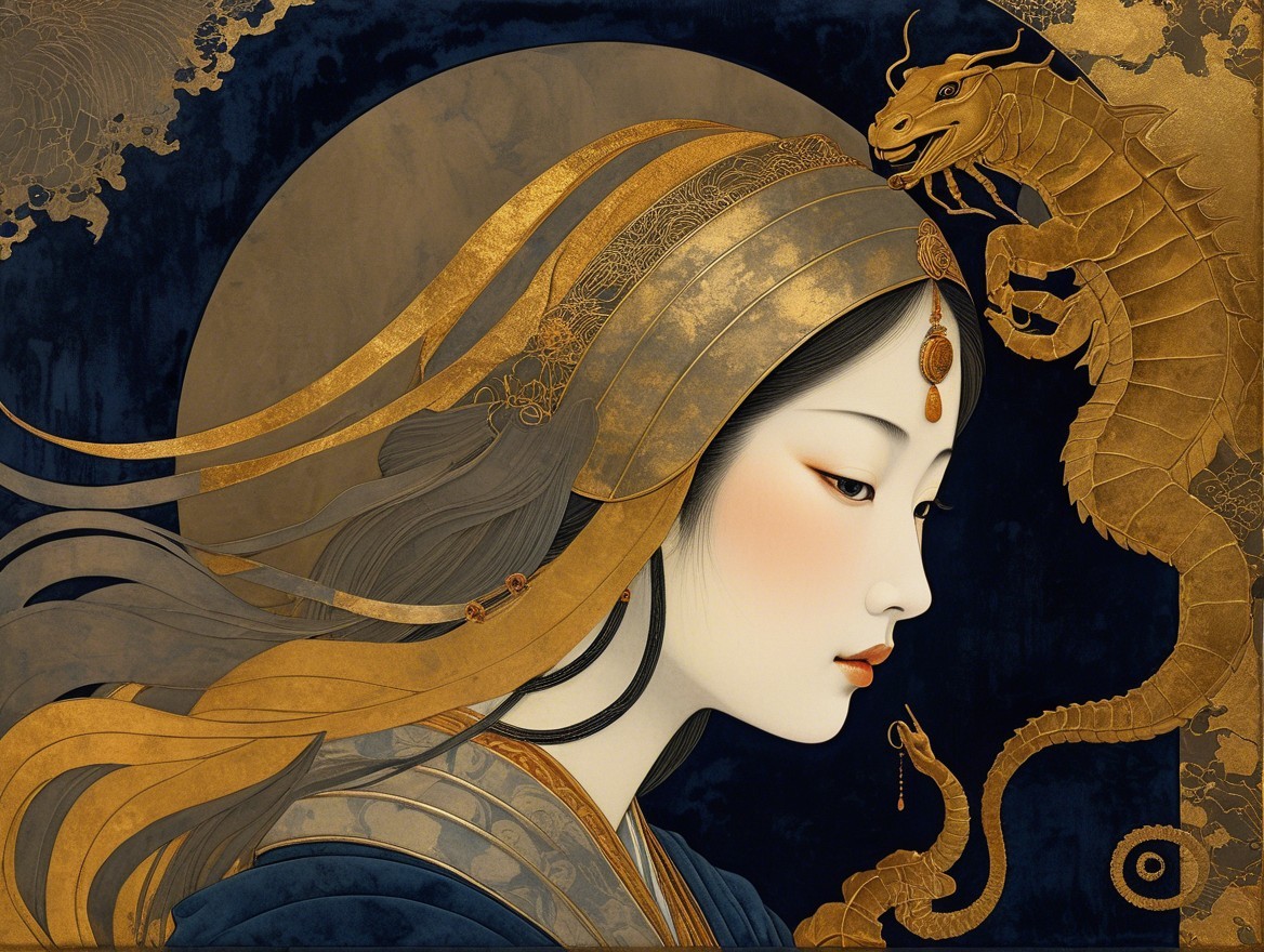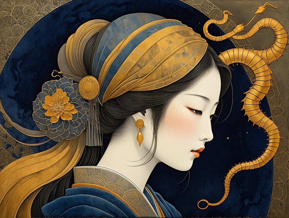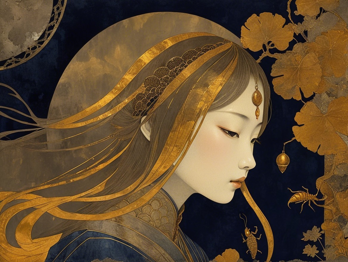 Legend of the Girl and the scorpion, Medieval Japanese Artists Sumi-e Style, Velvet indigo, Shabby, Dull Gold, Amber Gray, marbled. dramatic