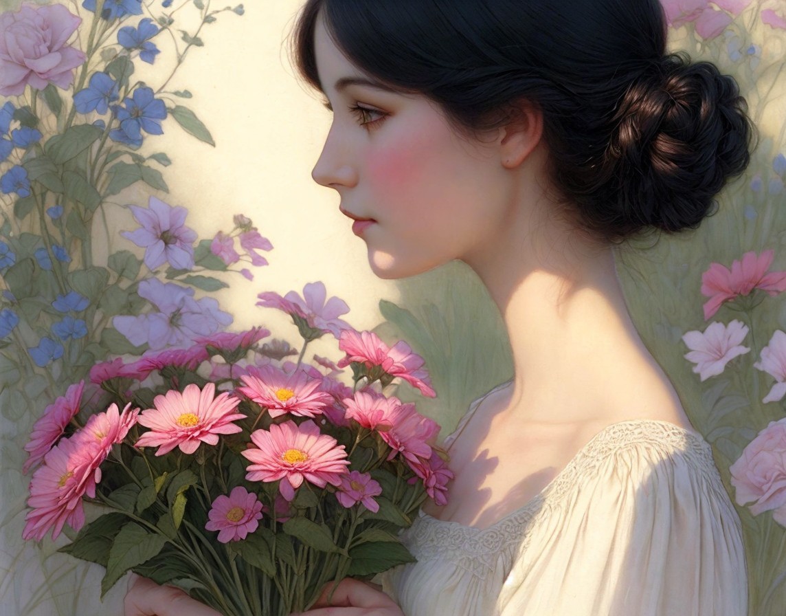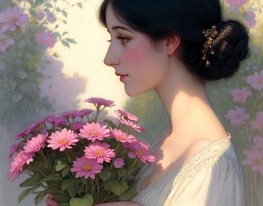 A woman with a serene expression is gazing to the side, surrounded by soft pink flowers; the image has a tranquil, painterly quality.