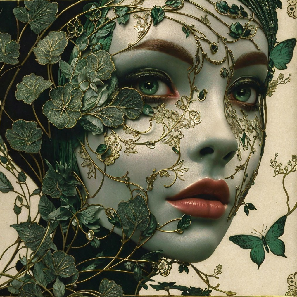 Artistic depiction of a woman with a face intertwined with golden, leafy vines and butterflies, conveying a mystical or nature-inspired theme.