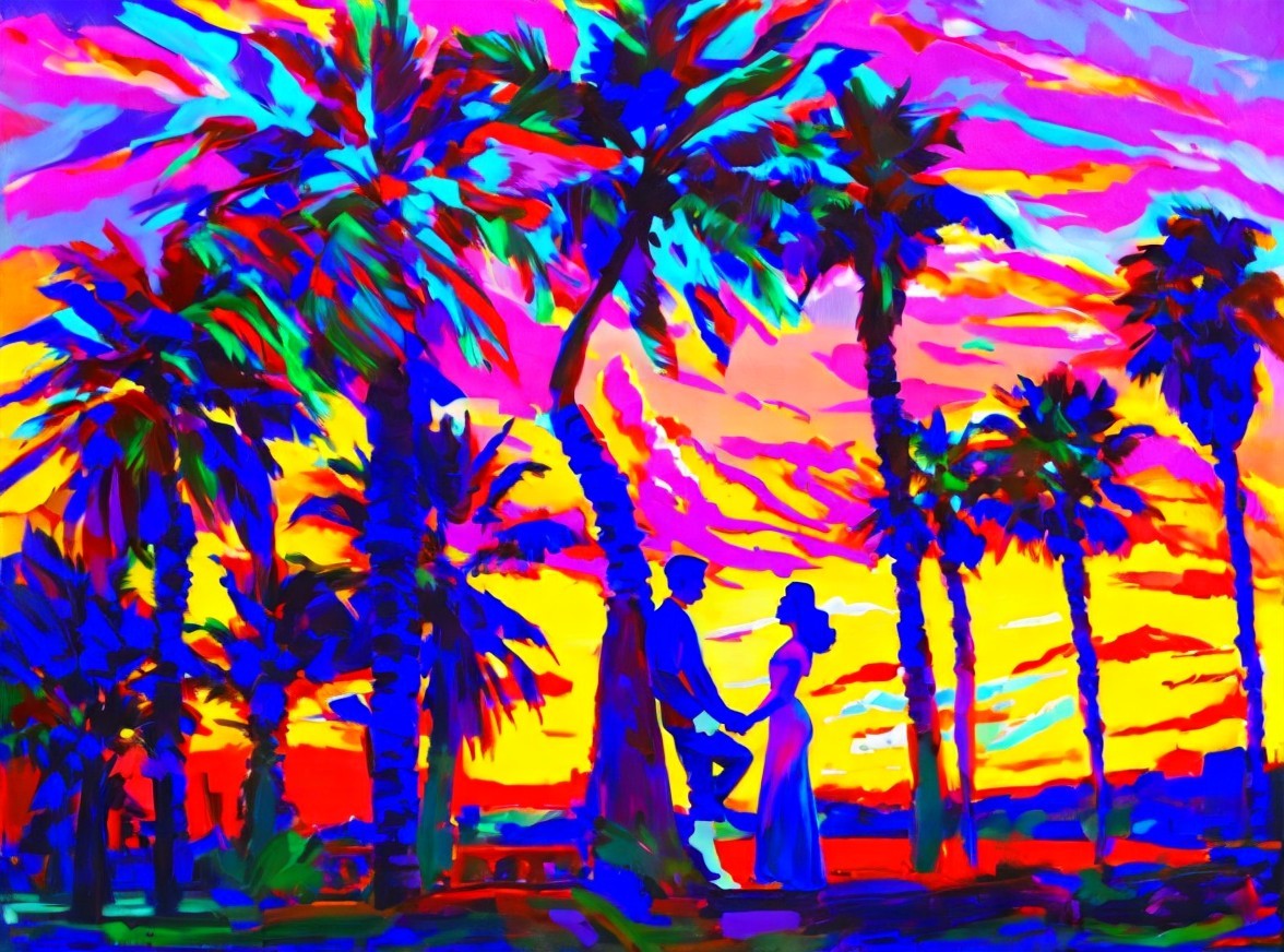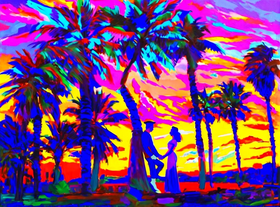 A vibrantly colored image with a couple under palm trees against a psychedelic sunset sky.