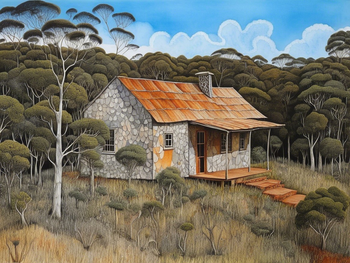 A charming cottage nestled in a vibrant autumn landscape, surrounded by colorful trees and lush foliage. The warm hues of the leaves complement the cozy architecture and inviting atmosphere.