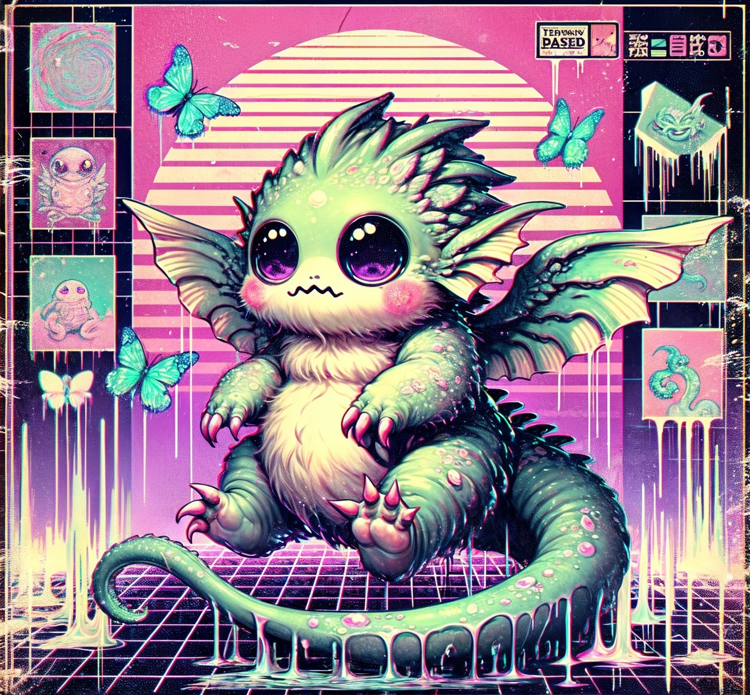 A charming depiction of a tiny, chubby Cthulhu with innocent eyes and miniature wings. The vintage anime style features a surreal, glitching reality filled with colorful monsters and vaporwave aesthetics.