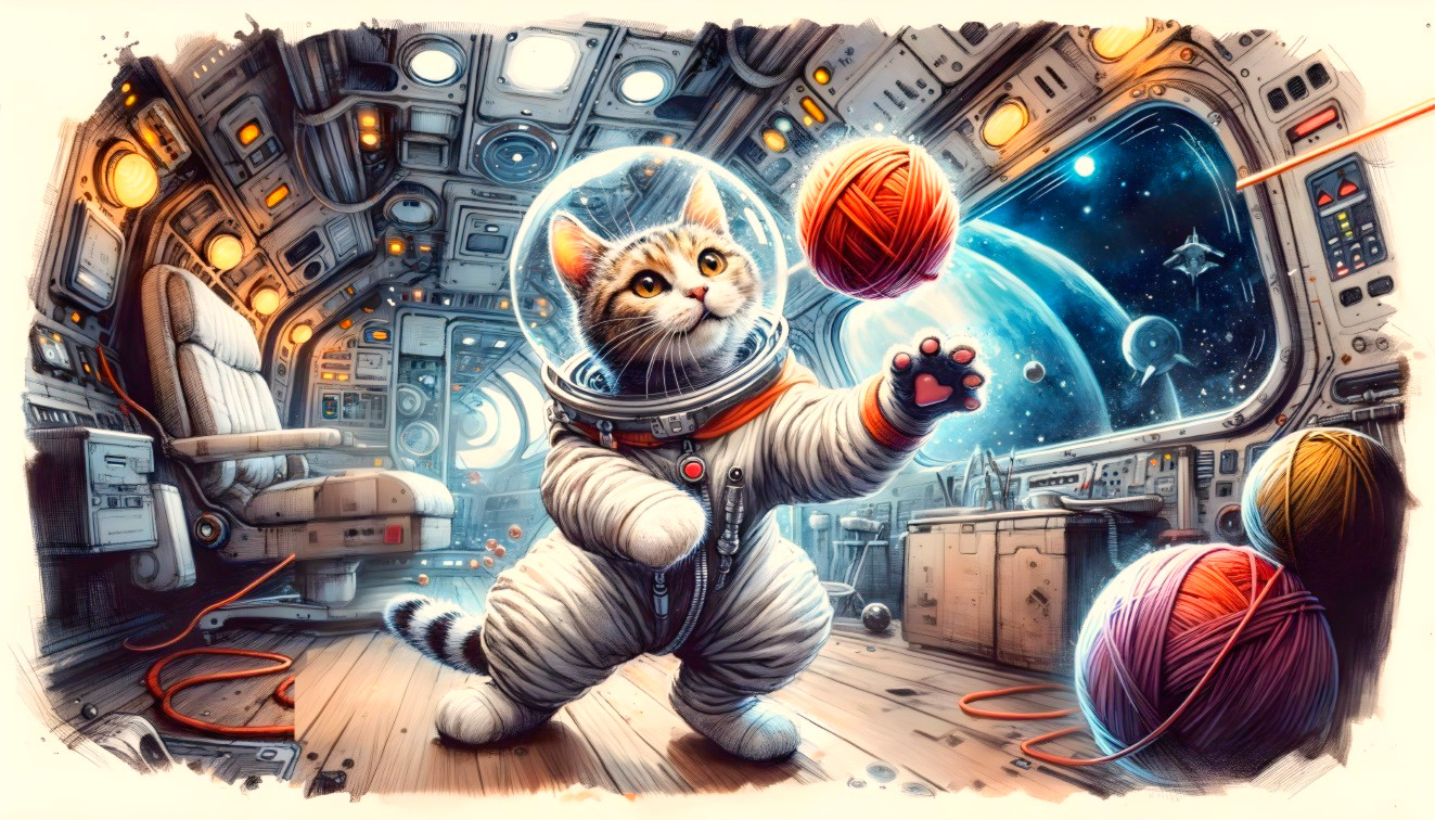 A playful cat in a spacesuit floats in zero gravity, playfully reaching for a ball of wool inside a spaceship. The scene is highly detailed and vividly depicted using various artistic techniques.