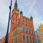 A stunning historic building with intricate architecture featuring tall spires and a clock tower. Cobblestone streets and vintage street lamps enhance the charming, nostalgic atmosphere.