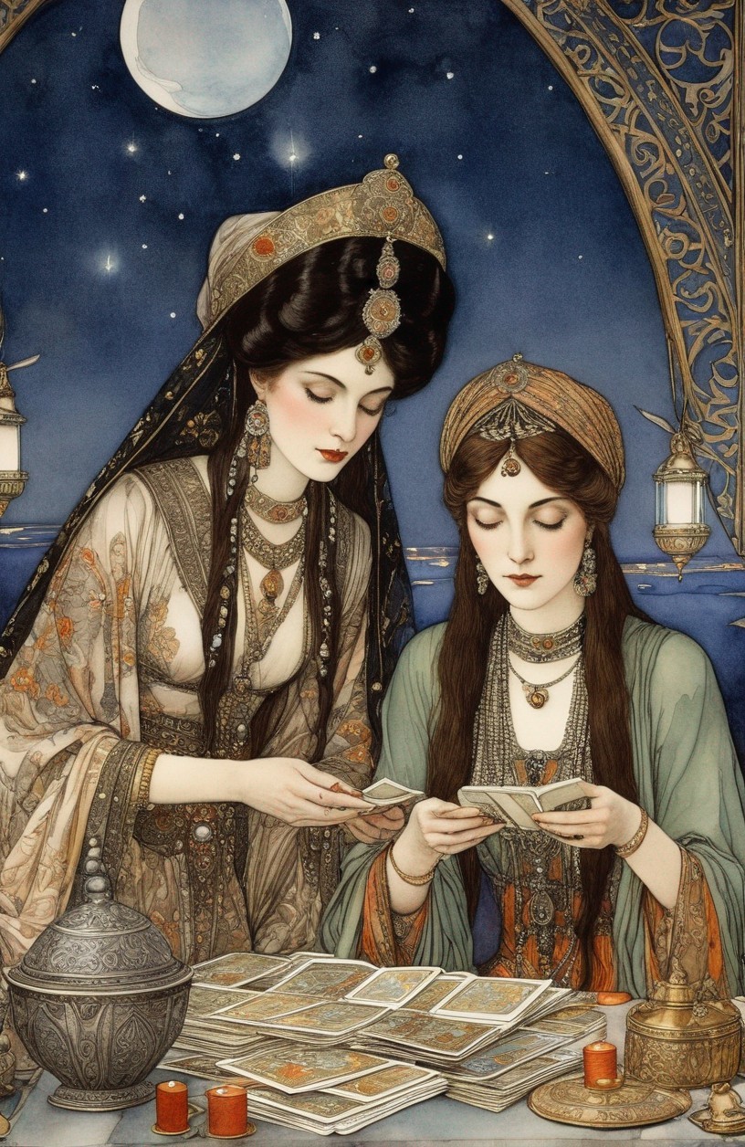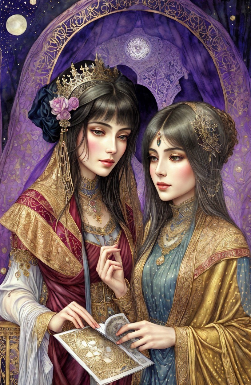 Three women in medieval attire read books while sitting by a window, with a flame, fruit, and pitcher on the table.