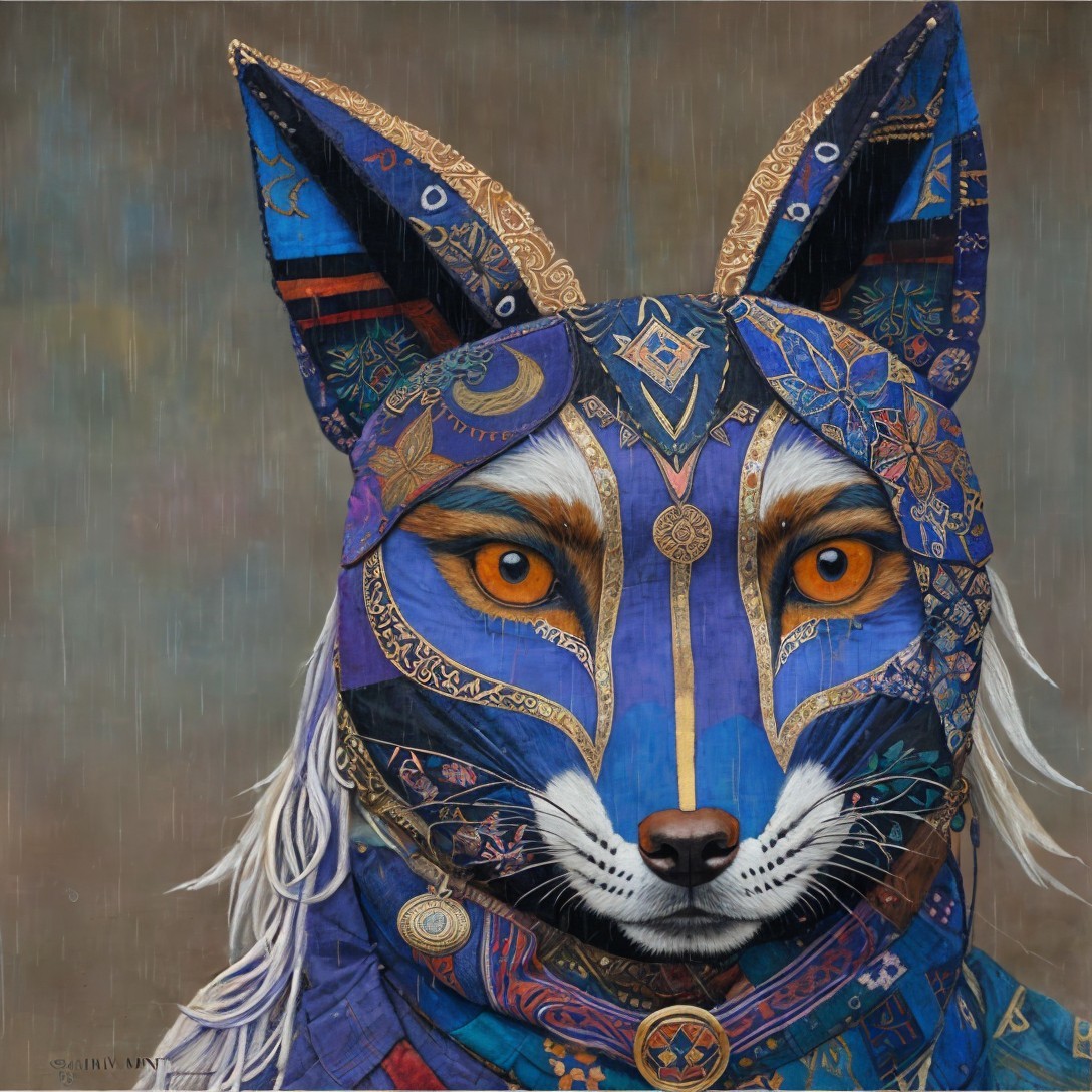 A vibrant, stylized painting of a fox with intricate patterns and a richly decorated headdress against a textured, muted background.