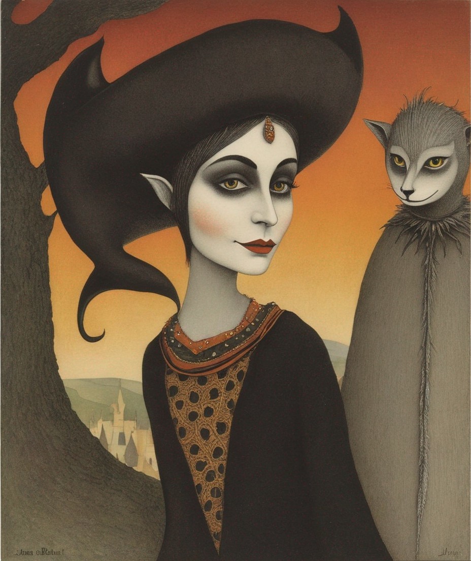 A whimsical painting of a person in a jester's costume with a tall blue hat, framed by red curtains and mirrors.
