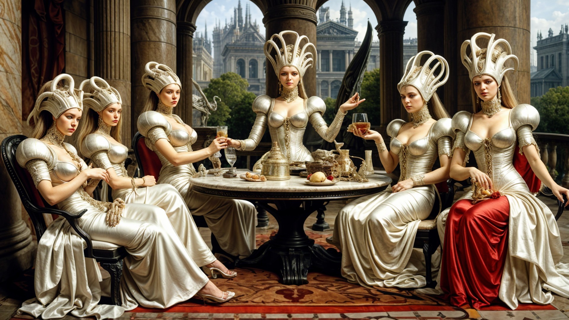 Three women sit at a table, each wearing striking metallic outfits and elaborate headpieces resembling large horns. They hold flutes of champagne, set against a grand, ornate backdrop.