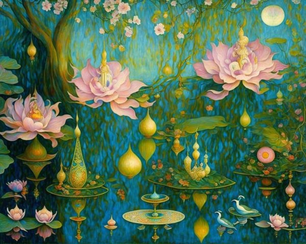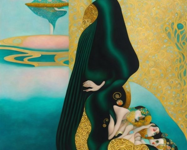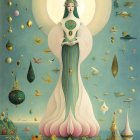 A serene, ethereal figure stands tall against a dreamy backdrop, adorned in aqua and gold. Surrounded by whimsical creatures and celestial elements, she embodies grace and mystique.
