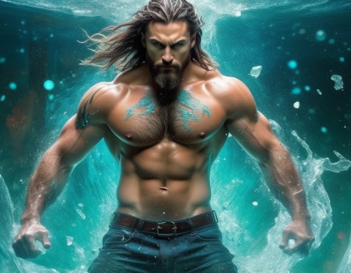 A muscular man with long hair and tattoos submerged in water, gazing intently.