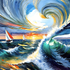 A dramatic seascape featuring a lighthouse amidst towering waves under a swirling sky. The sunset bathes the scene in vibrant colors, highlighting nature's power and beauty.