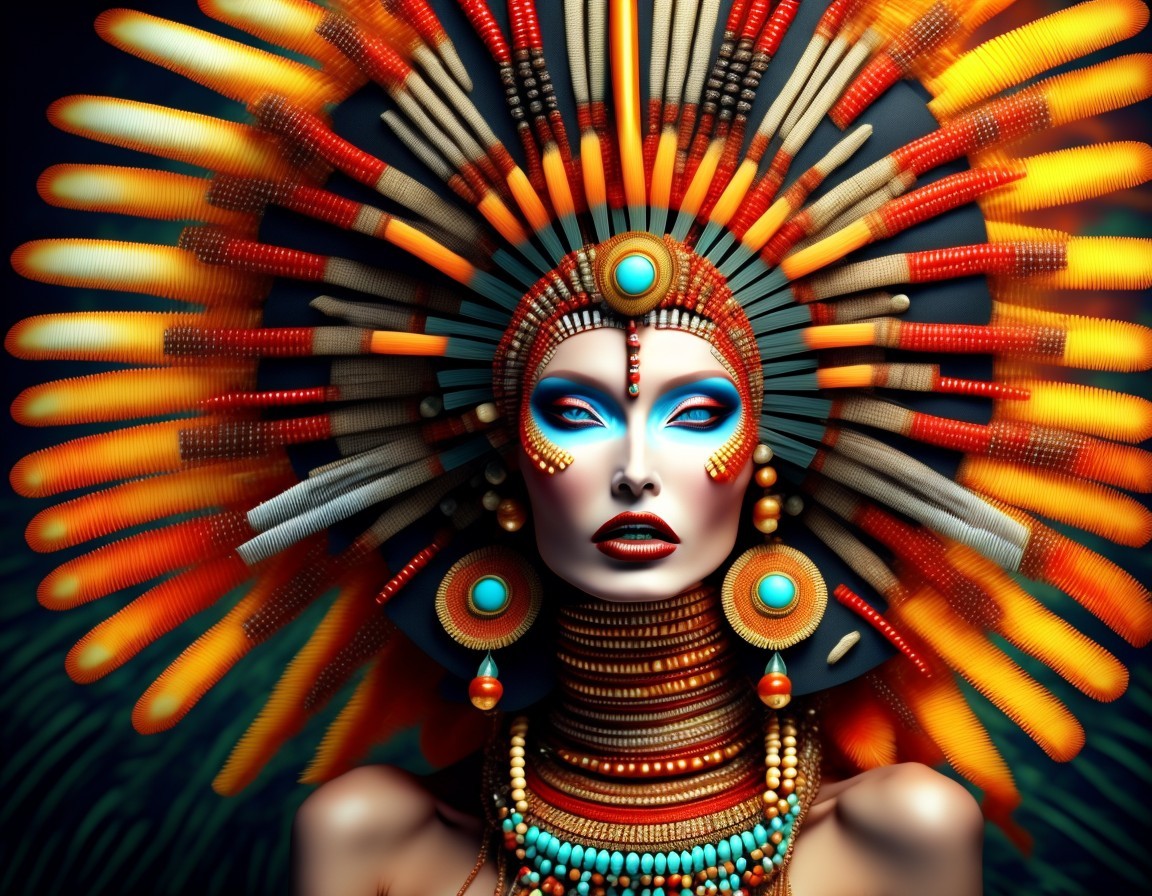 A vibrant digital artwork of a woman with an elaborate feather headdress and striking blue and orange makeup, exuding a tribal, mystical aura.