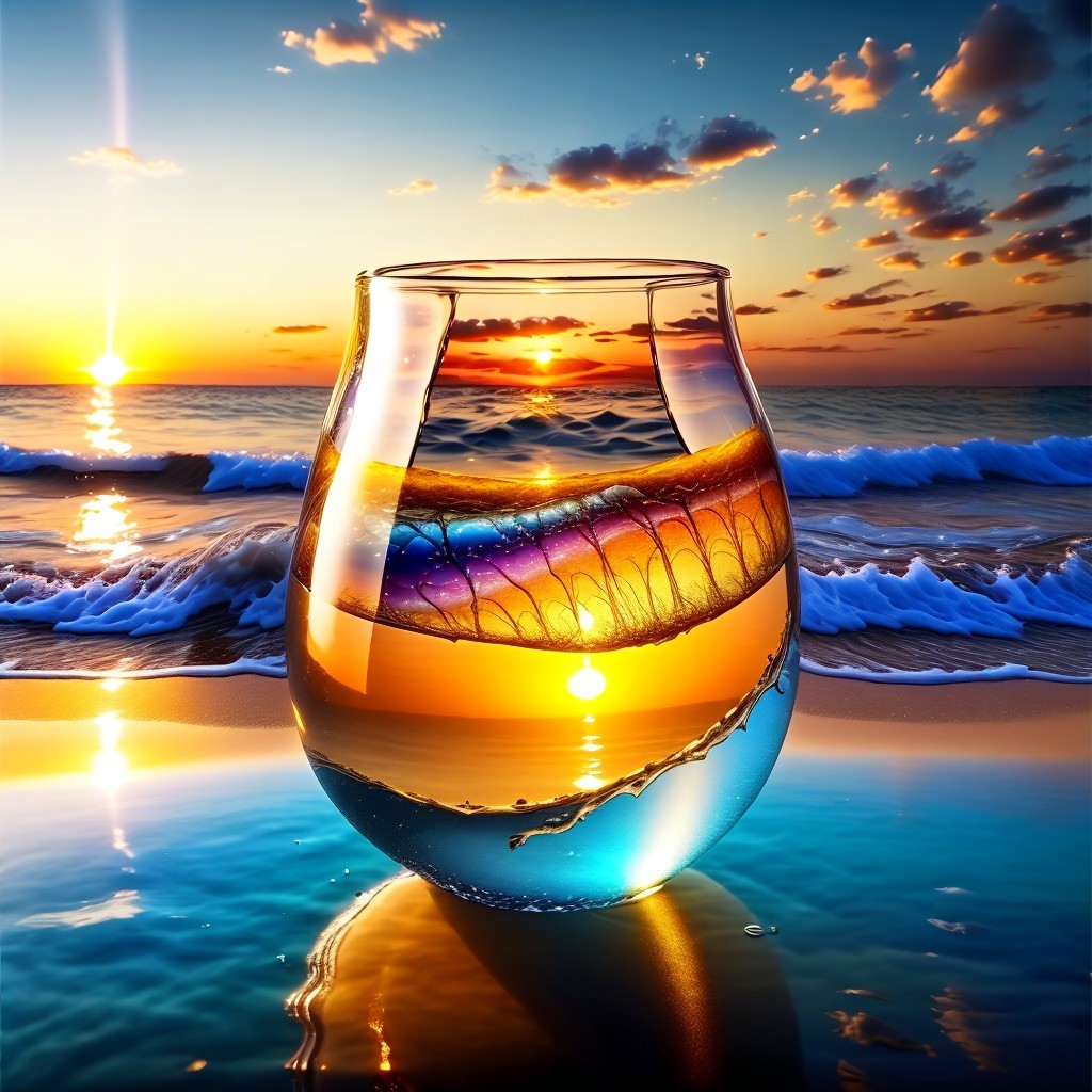 A glass of whiskey on a sandy beach captures the sunset's reflection, blurring the line between the drink and the seascape.
