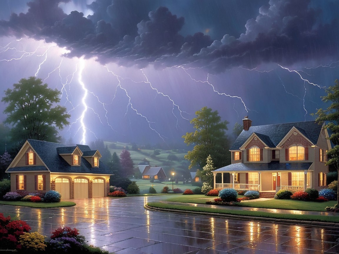 A peaceful suburban scene portrays two charming homes under a dramatic night sky. Lightning illuminates dark clouds, while rain pools on the street, reflecting warm lights from the houses.
