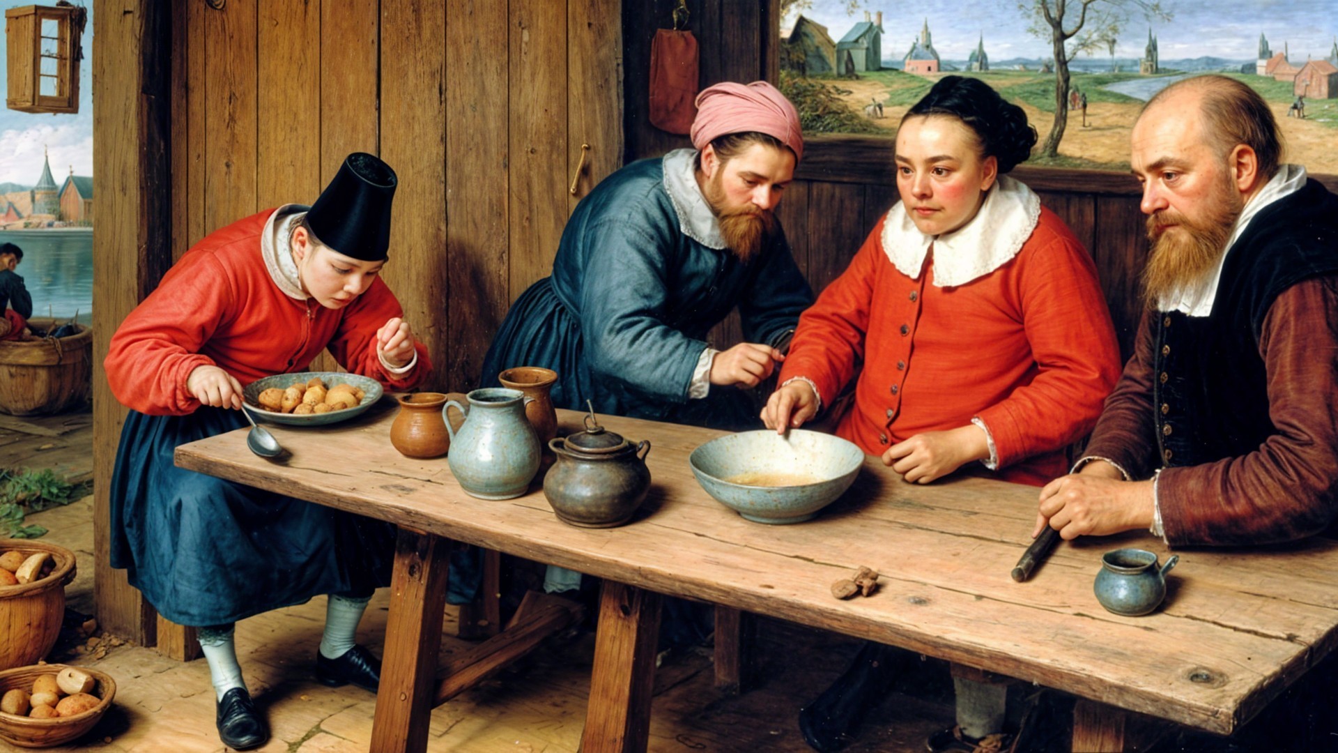 In a rustic kitchen, a family prepares a meal together. Two men and a woman lean over a table, while a young girl curiously watches. Baskets of potatoes suggest a harvest theme. Natural light floods the room. Note: This is taken from an eighteenth century painting by Adriaen Brouwer entitled Pancake.