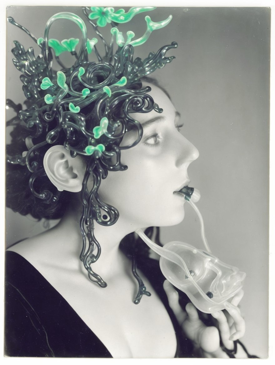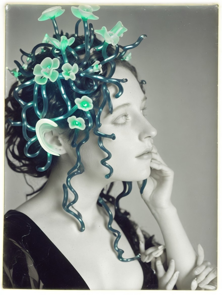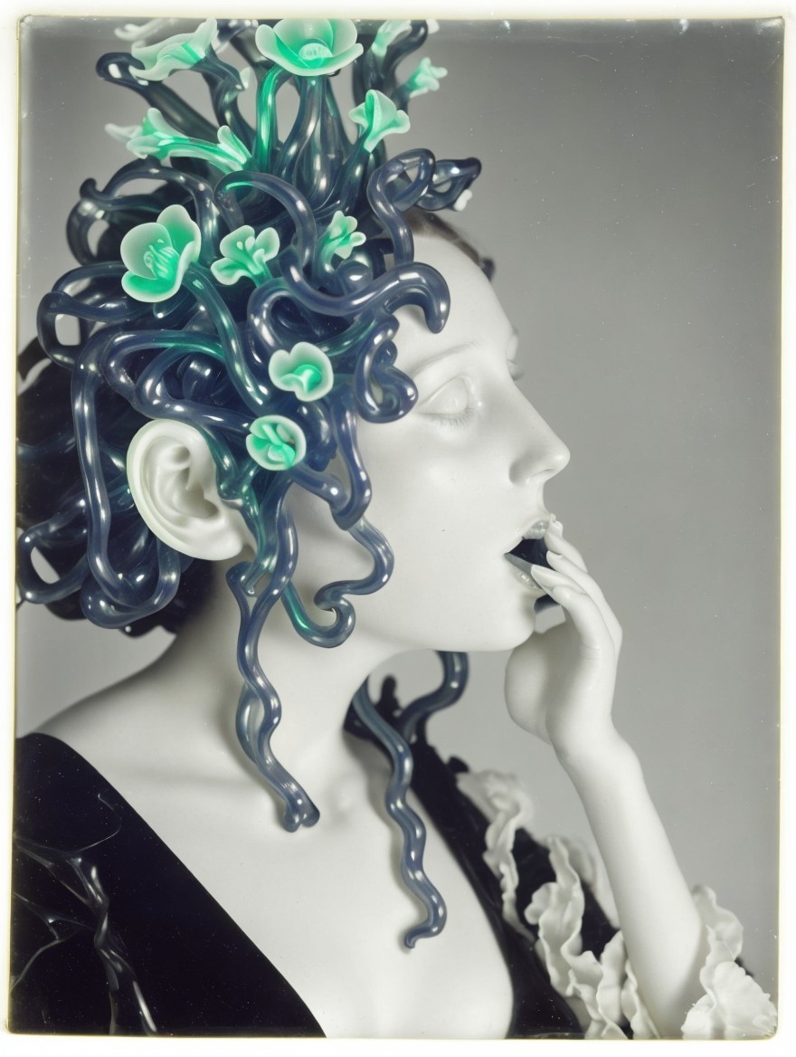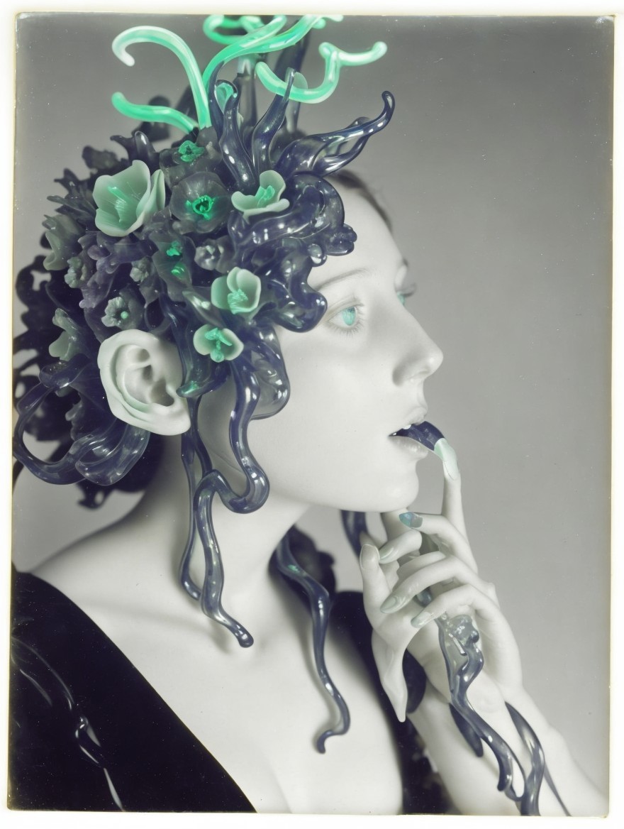 A woman with an artistic hairstyle consisting of blue spirals and green flowers, posing with a serene expression.