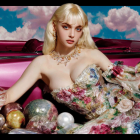 A glamorous figure poses in a vibrant floral gown, reclining in a pink convertible against a dreamy sky filled with fluffy clouds, exuding elegance and charm.