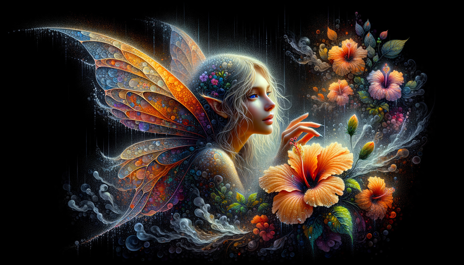 Visualize an (((ultra detailed fairy))), its hyperdetailed eyes and intricate wing feathers, sipping nectar from a hibiscus flower, Raindrops keep falling on her head, set against a (black background) with an (advanced artist's attention to detail), she is enjoying the summer rain, art by Jean Baptiste Monge, Carne Griffiths, delicate features, impressionistic floral patterns, warm tones, fair skin, ethereal glow, dream-like portrait, voluminous long flowing hair, piercing blue eyes, light makeup, small well-defined nose, full pink lips, painterly orange hibiscus, swirling array of flowers, abstract shapes, orange, pink, red, purple shades, misty/frosted glass effect, lush wet garden atmosphere, realistic figure with impressionistic background, whimsical composition; Masterpiece, intricate Dada art, delicate glass string art, 3D texture brushlines, pink, orange, lemon, violet, and yellow, and complementary colors, ethereal aesthetic, pale skin, delicate facial structure, elaborate swirls, abstract space, artistic fantasy, detailed and textured, vibrant colour palette, cascading raindrops, wet hair strands, expressive eyes, emotive facial features, flowing red locks, enjoyment, dramatic atmosphere, stormy skies and blurred rain in background, intricate brushwork, rich colour palette, dynamic lighting contrasts, masterful realism, evocative mood, emotional depth.