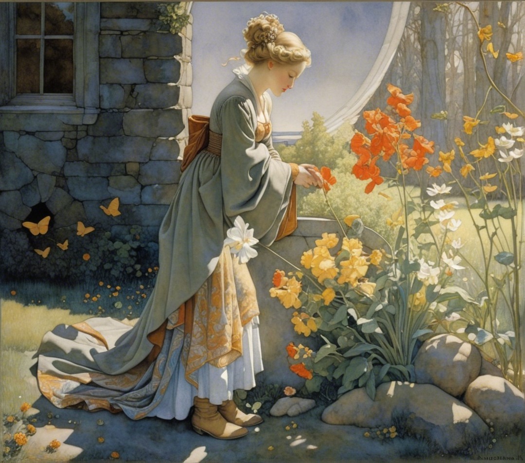 The image depicts a serene maiden in a flowing white gown with golden accents, gently tending to vibrant flowers by a stone wall, with a distant landscape and a cozy fire visible nearby.