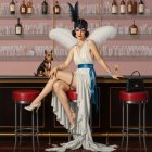A glamorous woman in a flowing white dress with feathers and a blue sash sits at a bar, accompanied by a small dog. She exudes elegance, with a glass of drink and stylish accessories nearby.