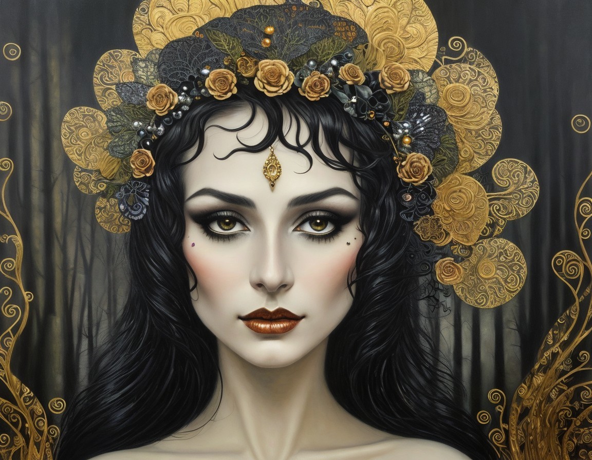The artwork features a striking woman with skull makeup and dark, elegant attire, adorned with a jeweled crown. A mystical, autumnal backdrop includes gothic architecture and a night sky.