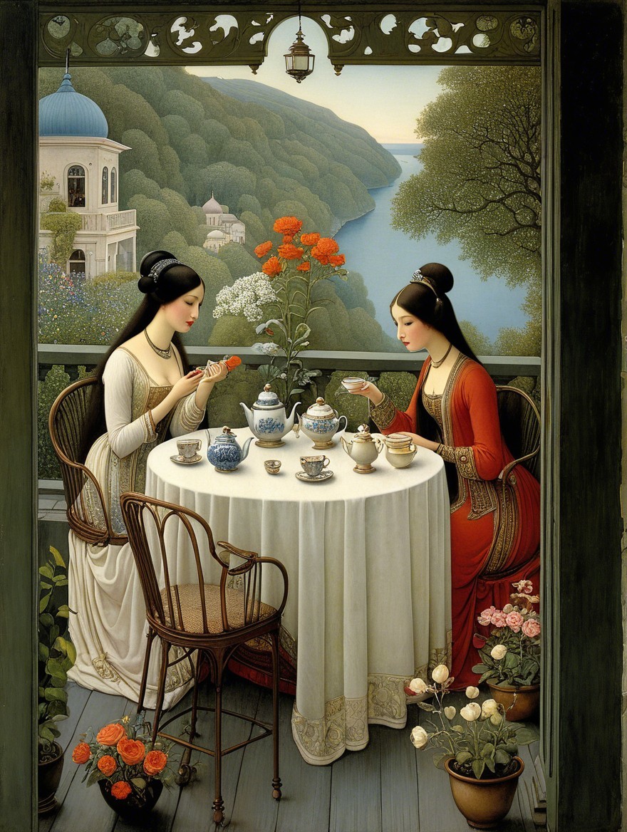 Two elegantly dressed women sit at a beautifully set table on a balcony, enjoying tea. The picturesque landscape features a serene lake, lush greenery, and blooming roses in the foreground.