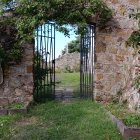 Serene Garden Scene with Wrought-Iron Gate and Flowers