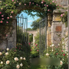 A beautiful garden scene featuring an arched stone gateway adorned with blooming roses. Lush greenery and vibrant flowers lead to a serene path, inviting exploration into the enchanting garden beyond.