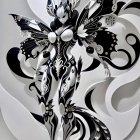 A striking figure stands in a captivating pose, adorned in a sleek, dark armored outfit with intricate designs. Majestic, large wings spread behind, creating a dramatic and enchanting presence.