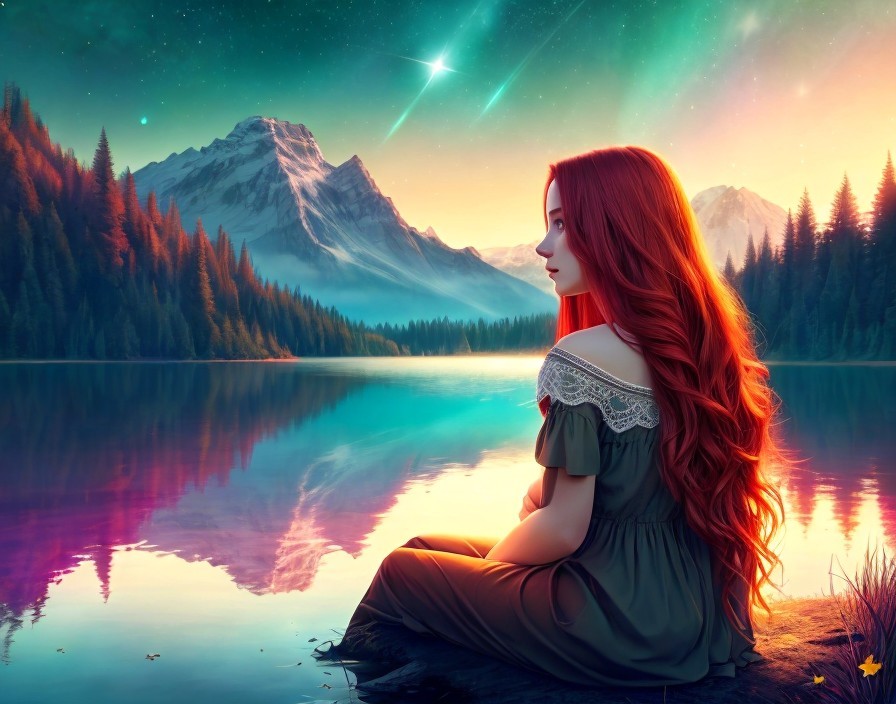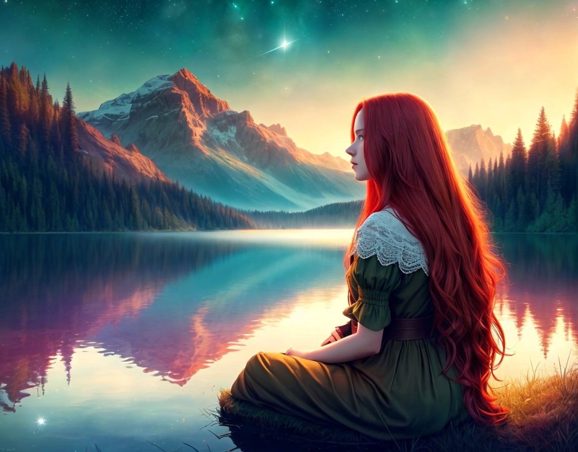 Red-haired woman admires shooting star over mountain lake at sunset