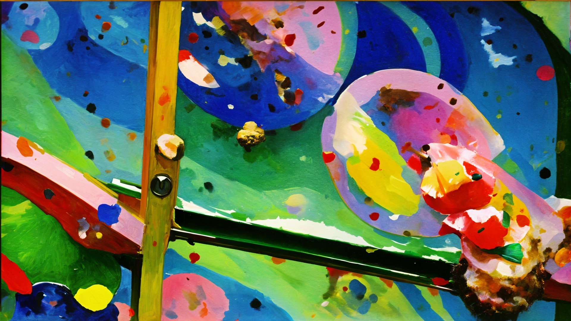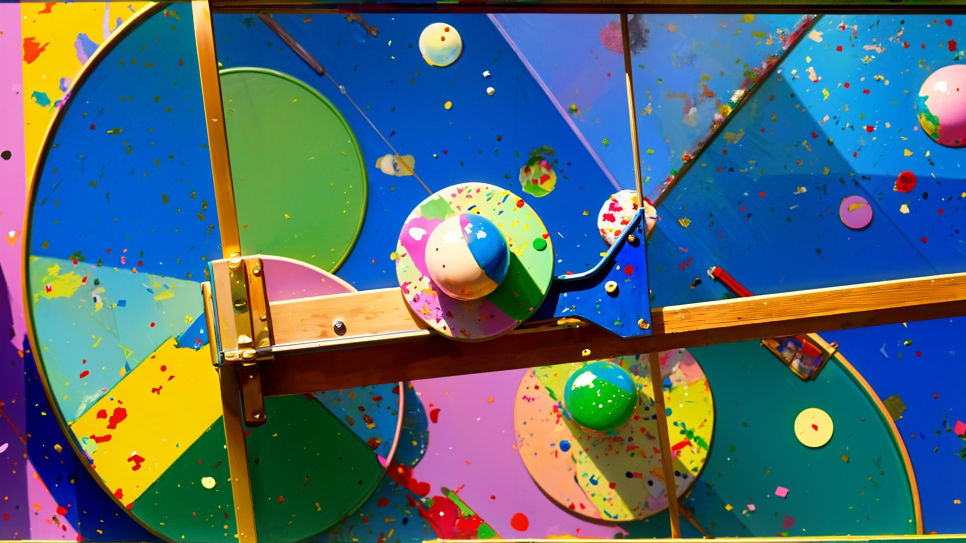 A vibrant, whimsical 3D scene featuring playful geometric shapes, colorful spheres, and dynamic textures against a bright blue backdrop, creating a sense of motion and creativity.
