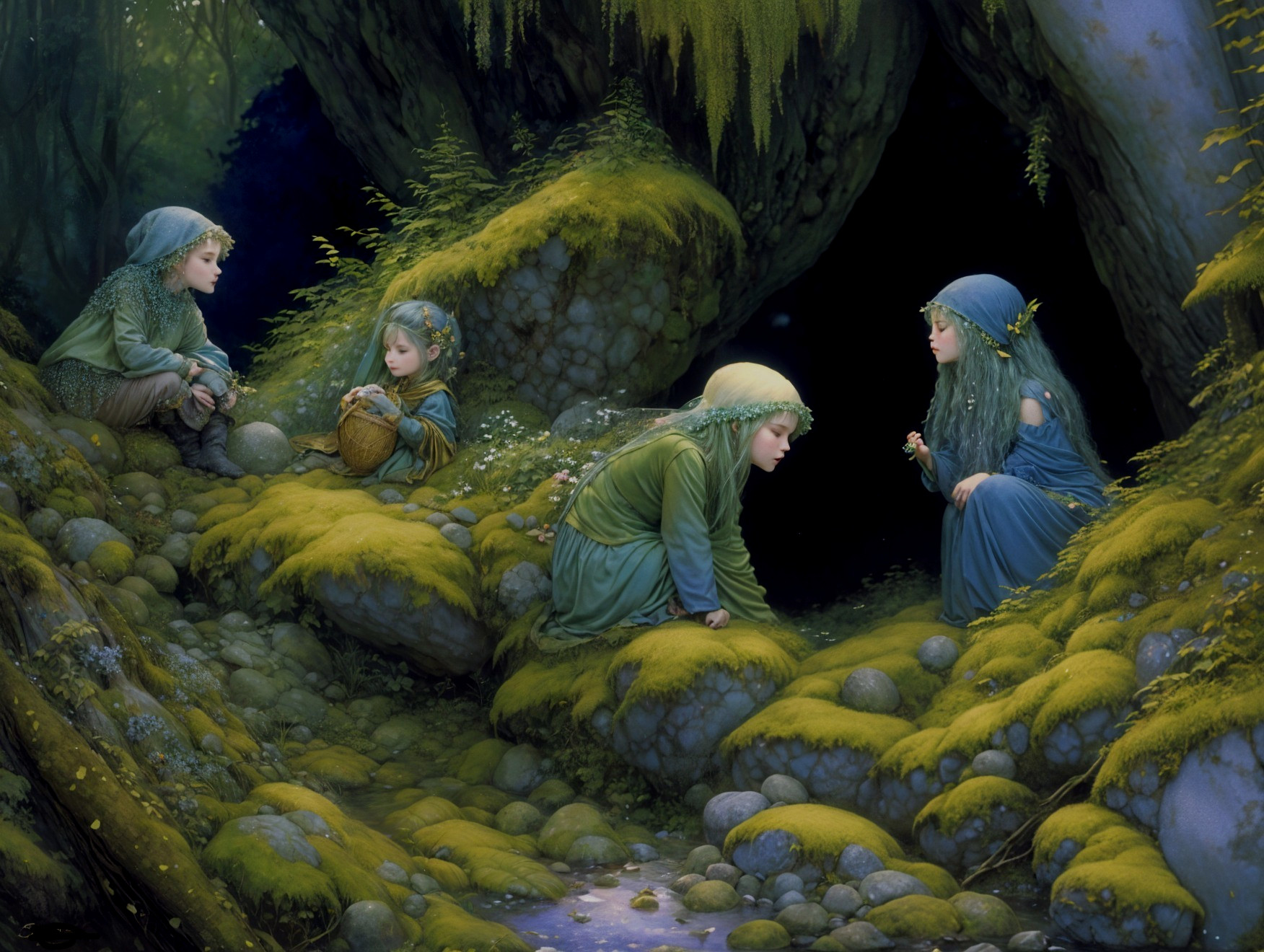 In a magical forest, four ethereal figures in pastel costumes gather around a stream, surrounded by lush moss and stones, embodying a whimsical, peaceful scene of nature and friendship.