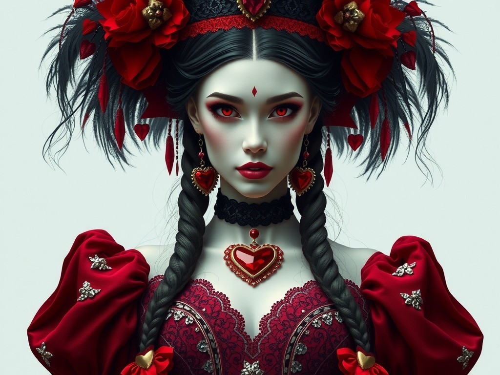 Prompt: "Create an image of a striking and ethereal queen inspired by the theme of hearts. She has pale, porcelain-like skin with an almost ghostly appearance. Her body shape is curvaceous, accentuated by an elaborate, Victorian-style gown predominantly featuring rich red and black colors. The gown has puffed sleeves, intricate lace detailing, and a sweetheart neckline adorned with shiny heart-shaped embellishments.