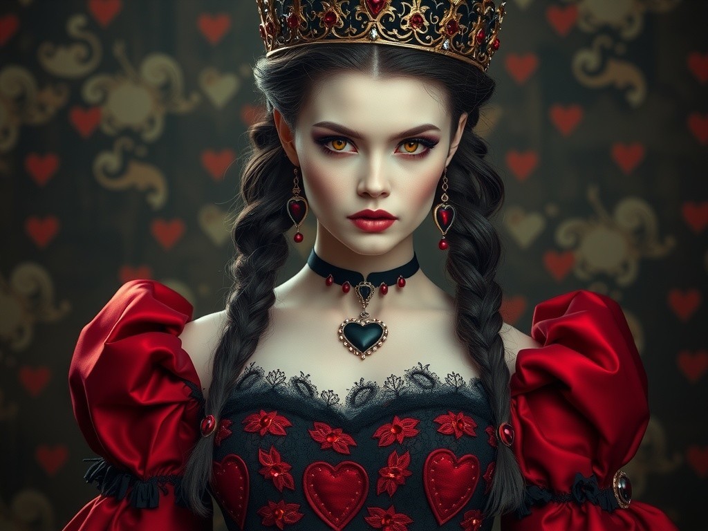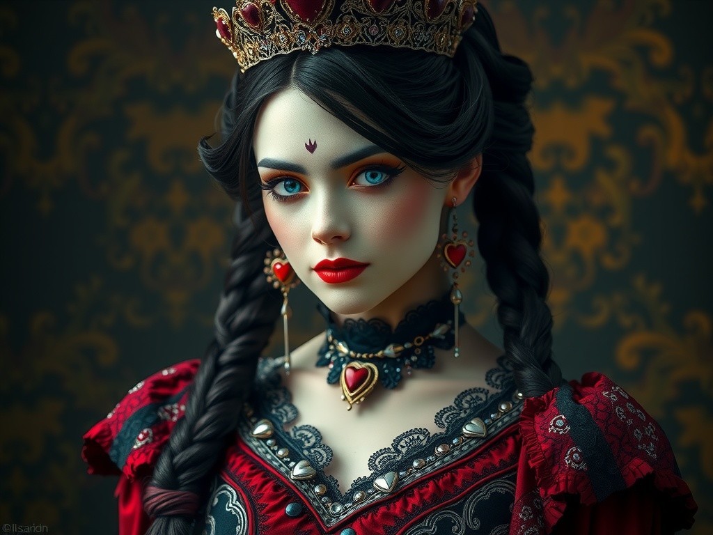On her ears hang delicate earrings shaped like hearts, and around her neck, she wears a choker that features a heart pendant. Her lips are painted a deep red, further emphasizing her dramatic look. Crowning her head is a majestic tiara with heart motifs, complementing her royal attire. The background is dark, enhancing the contrast of her vibrant outfit and giving the entire composition a hauntingly beautiful atmosphere.