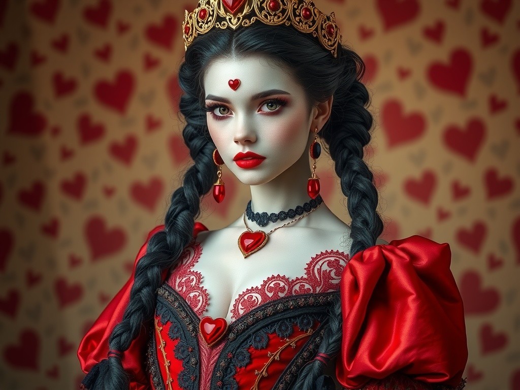 Create an image of a striking and ethereal queen inspired by the theme of hearts. She has pale, porcelain-like skin with an almost ghostly appearance. Her body shape is curvaceous, accentuated by an elaborate, Victorian-style gown predominantly featuring rich red and black colors. The gown has puffed sleeves, intricate lace detailing, and a sweetheart neckline adorned with shiny heart-shaped embellishments.