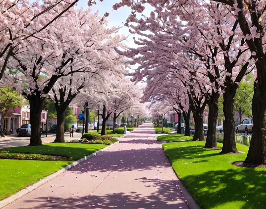 A picturesque suburban street lined with blooming pink cherry blossom trees, casting a soft hue on the sunny, tranquil pathway.