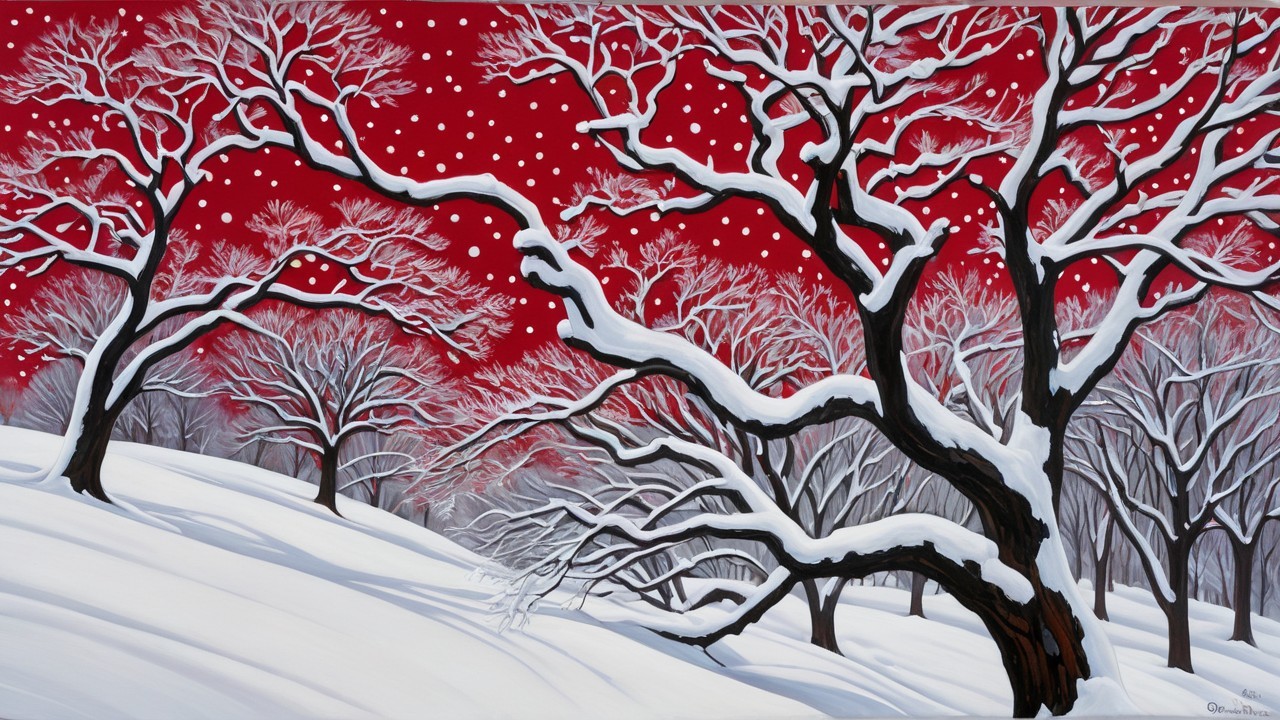A digital painting depicts a snowy landscape with a bright red sky filled with small white dots that create the illusion of falling snow. The foreground shows several trees with dark brown trunks and branches heavily laden with thick white snow. These trees have a somewhat skeletal, gnarled appearance due to their bare branches.