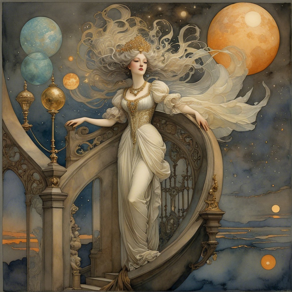 A celestial figure draped in flowing garments, adorned with floral elements. She gracefully wields a scepter, surrounded by moons and a starry sky, embodying ethereal beauty and harmony.