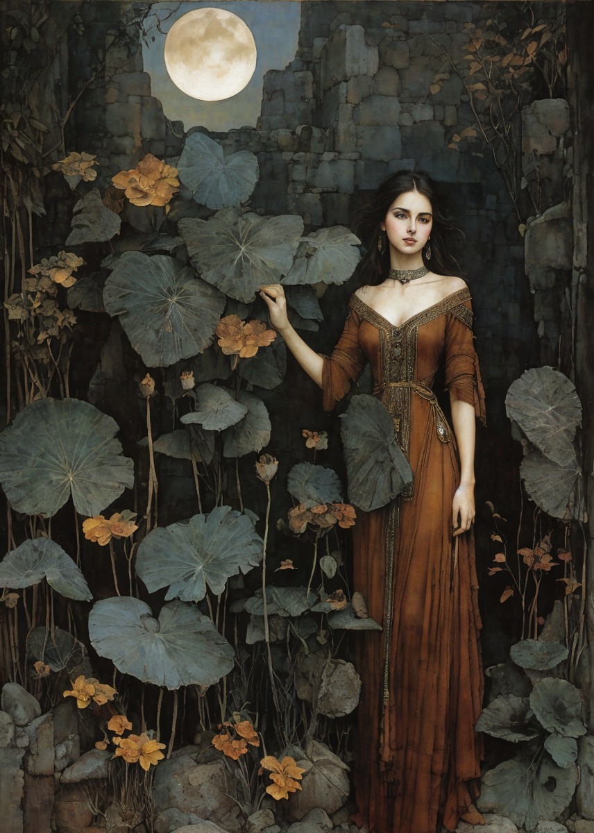Ancient cities, ancient tales. Ancient spirits Beautiful exotic woman. Arthur Rackham Paul Klee Norman Rockwell anatomically correct Steve Hanks muted tones symmetrical face Ochre Big brown eyes Subdued palette wide open dark eyes Symmetrical eyes, nose and mouth moody, somber, desaturated colors Soft, somber, delicate Soft dappled lighting. Golden hour. Leonardo, Durer, Schiele, Degas, Mondrian - mixed media surreal Richard Burlet celestial Enki Bilal dynamic pose Esao Andrews enigmatic dreamy atmosphere susanne Jamie Heiden cosmic splendor Surreal dream In the darkness I dance